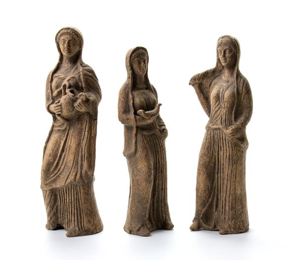 Lotto di tre tanagrine raffiguranti figure muliebri