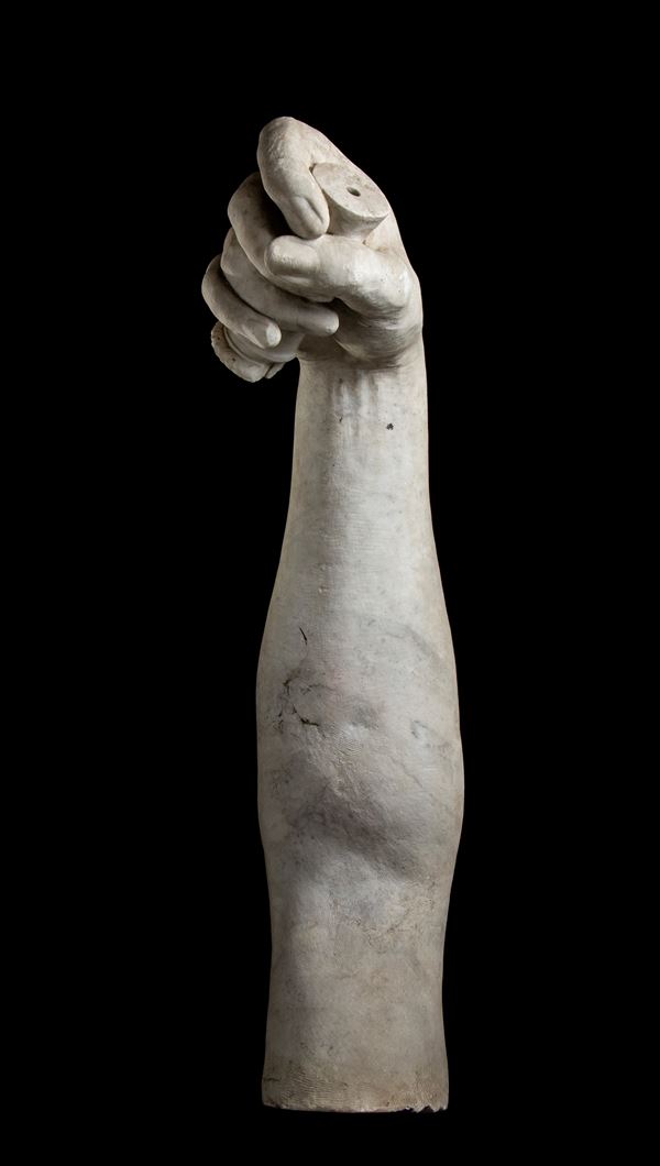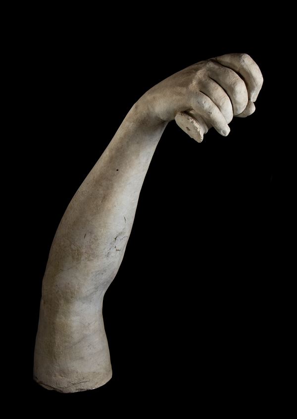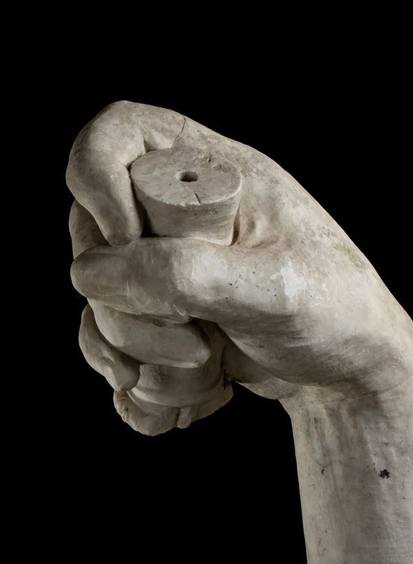 Maestoso braccio di imperatore in marmo bianco statuario stante a trattenere moncone di scettro su base in ferro battuto