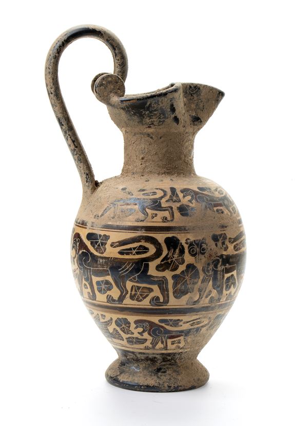 Oinochoe in ceramica arcaica a figure nere con becco carenato e decori zoomorfi su tre fasce