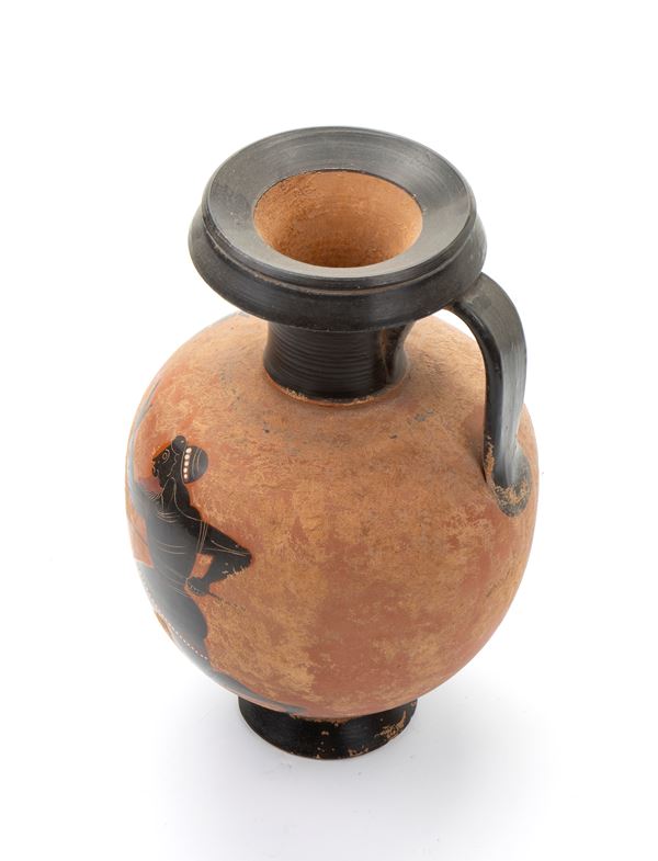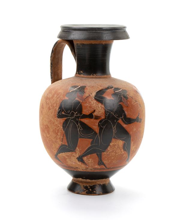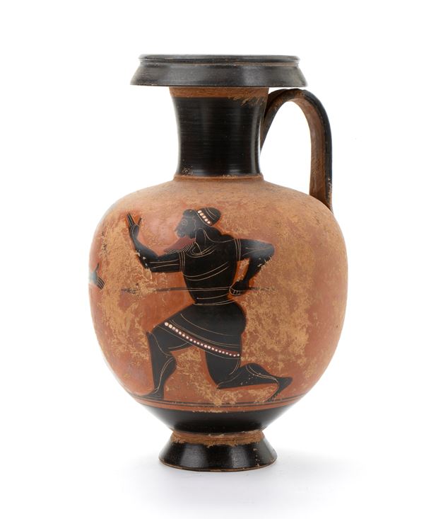 Oinochoe in ceramica arcaica a figure nere con coppia di atleti barbuti