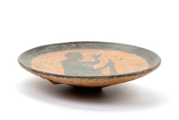 Piattino in ceramica arcaica a figure nere decorato con figura stante a sorreggere un panneggio