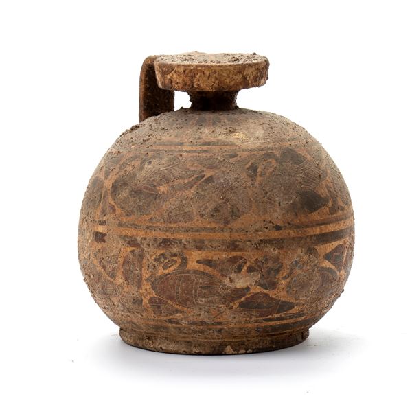 Piccolo vaso monoansato di forma sferica a figure nere con teorie di volatili