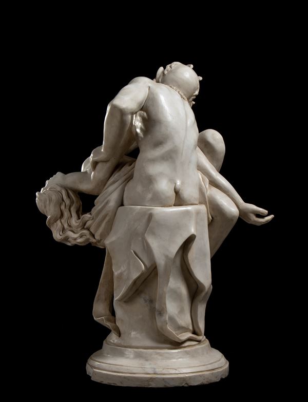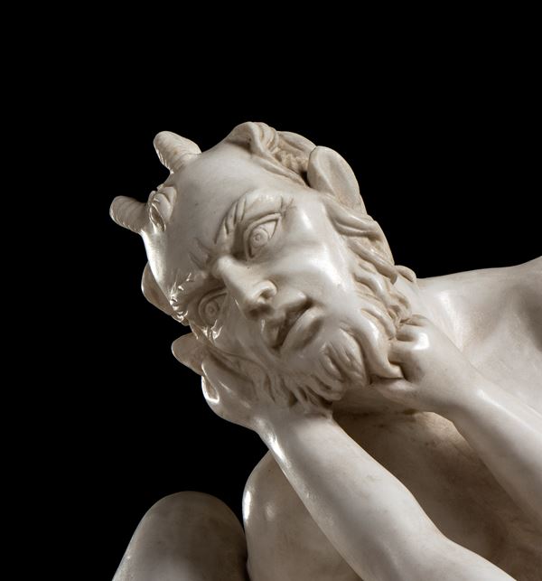 Scultura in marmo statuario scolpito a mano dal blocco a grandezza naturale raffigurante il dio Pan che salva Psiche dal suicidio