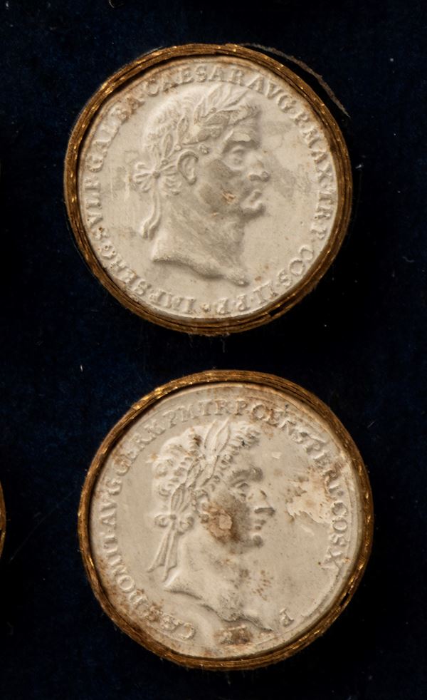 Teca in ferro patinato nero e trasparente conteneenti riproduzioni di antiche monete romane in gesso