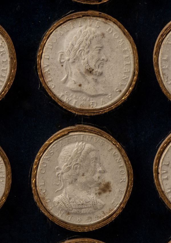 Teca in perspex laccato nero e trasparente conteneenti riproduzioni di antiche monete romane in gesso