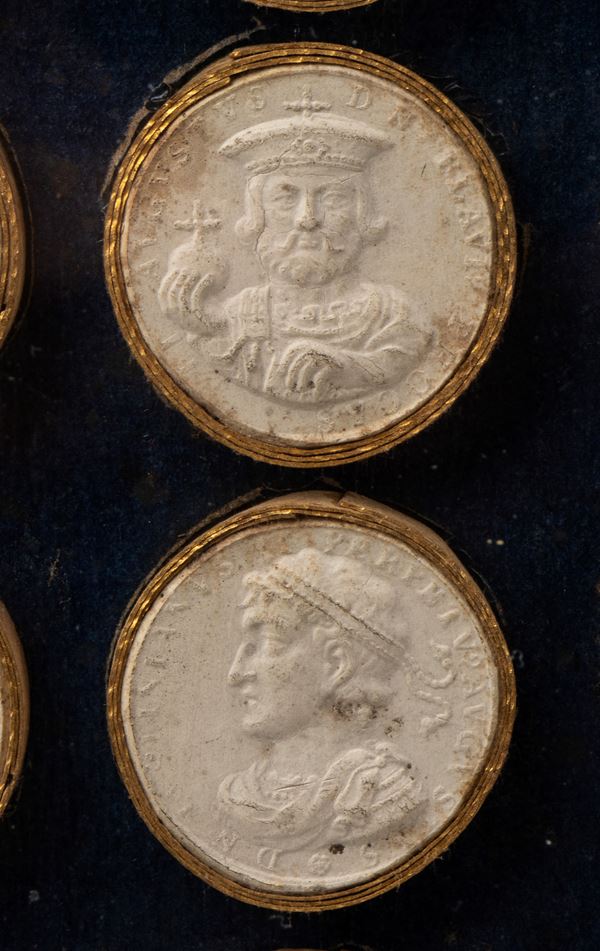Teca in perspex laccato nero e trasparente conteneenti riproduzioni di antiche monete romane in cera