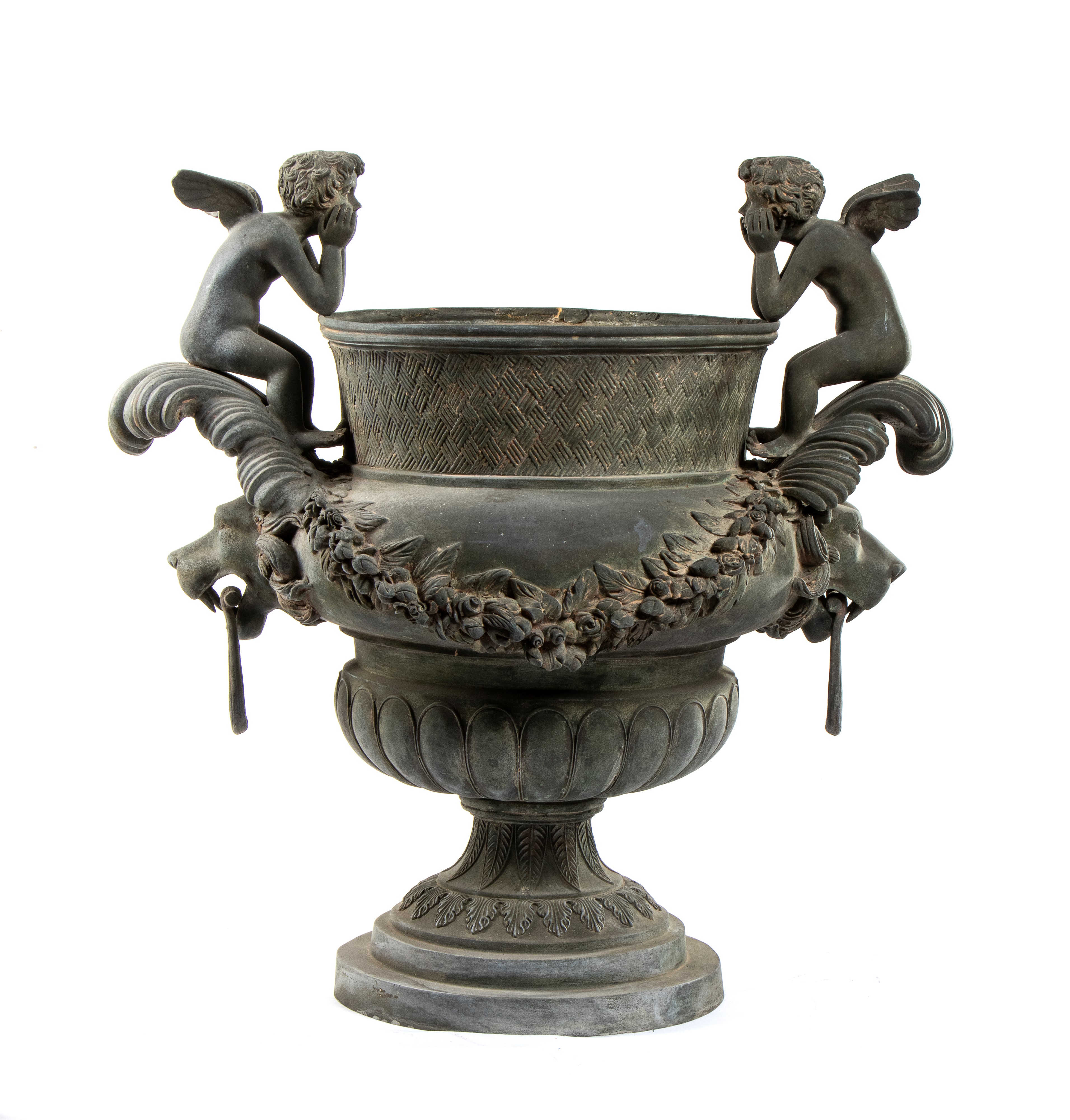 Coppia di grandi vasi bronzei con manici a guisa di leone sormontati da foglie di acanto e putti intenti a poggiare la testa sulle mani, raccordati [..]