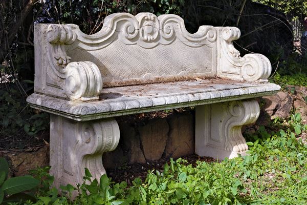 Coppia di panchine da giardino in polvere di cemento e marmo con schienale sagomato, braccioli e piedi a grandi volute