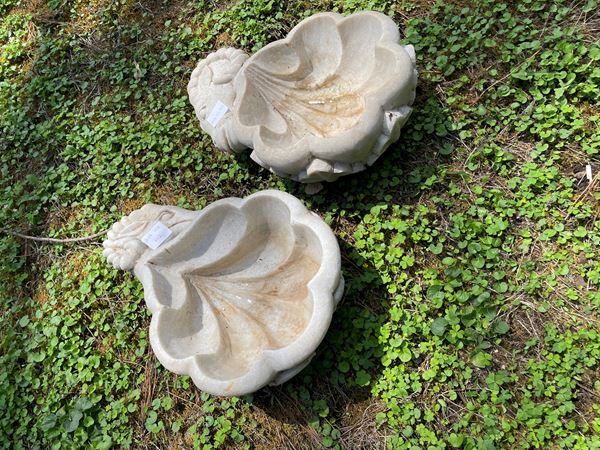 Lotto di due elementi decorativi in marmo a conchiglia con presa a montone e capra. Probabilmente piccole vasche da fontana