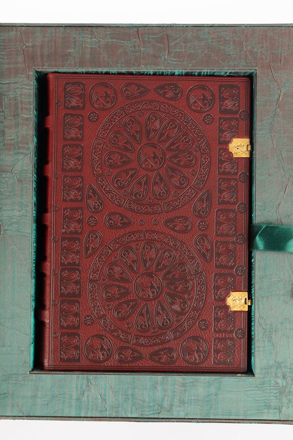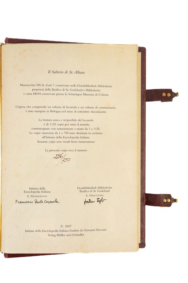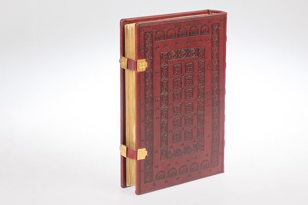 Legatura in pelle con impressioni a secco sui piatti e fermagli dorati di chiusura. Formato 19×28 cm. Pagine 418 (+1). Commentario in italiano (19×29 cm. pagine 277).
