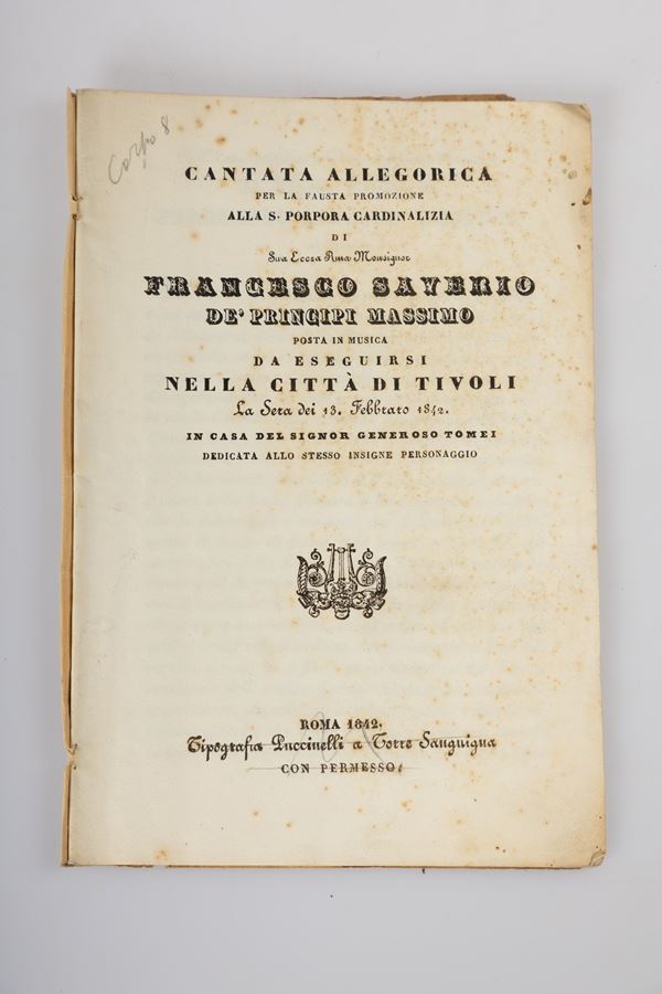 4)	Cantata allegorica per la fausta promozione alla S. porpora cardinalizia di S.E. Francesco Saverio dei Principi Massimo, posta in musica da eseguirsi nella città di Tivoli- 1842.