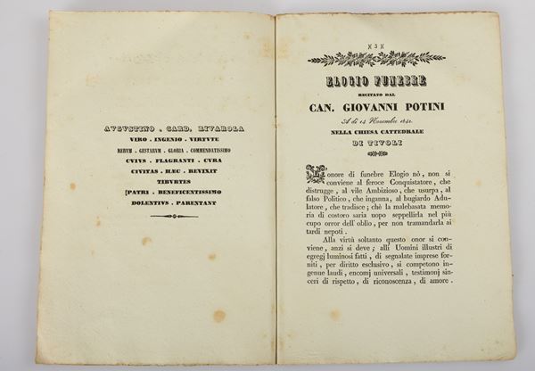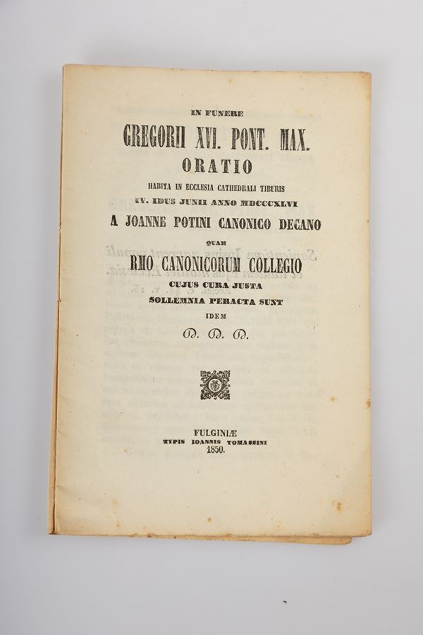 6)	In funere Gregorii XVI° Pont. Max. Oratio habita in Ecclesia cathedrali tiburis 4. idus Junii anno 1846. a Joanne Potini canonico decano - Foligno, 1850.