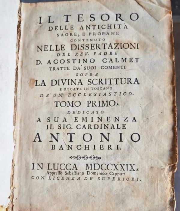 5) Calmet - Il tesoro delle antichità, tomo I° - Lucca, 1729. (illustrato da tavole incise in rame)