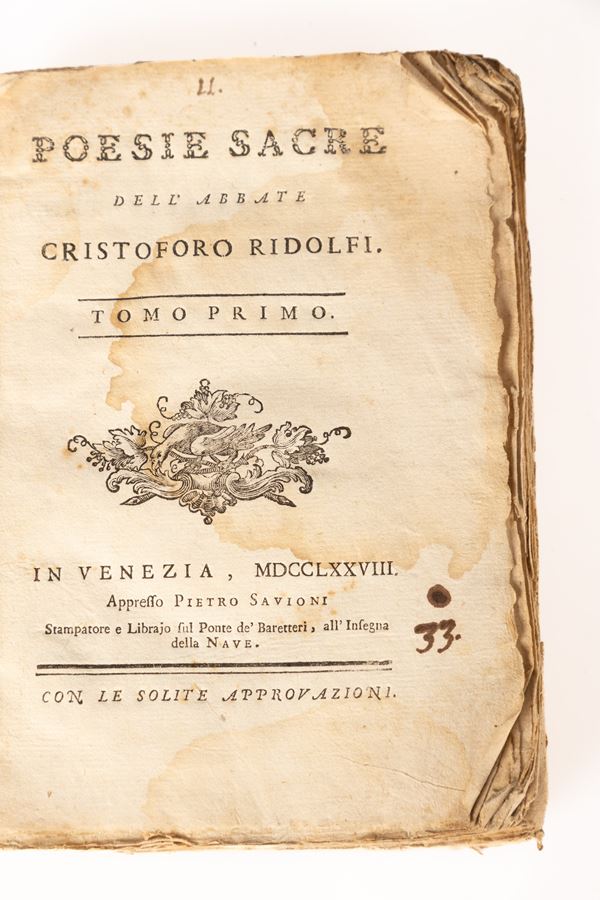 7)	Poesie Sacre dellʹAbbate Cristoforo Ridolfi. Tomo I° - Venezi, 1778.
