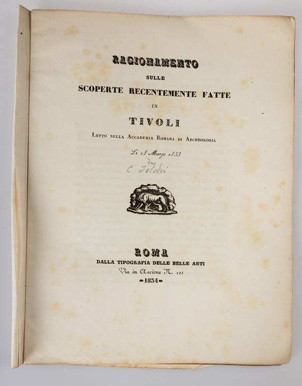 2)	Ragionamento sulle scoperte fatte in Tivoli dal marzo 1833 allʹaprile 1834 - Roma, 1834. (con una tavola ripiegata incisa in rame)