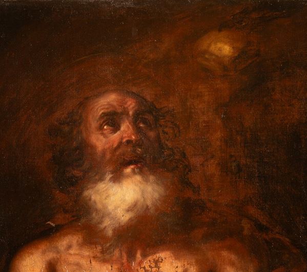 cm 100x76Nel dipinto è raffigurato San Paolo di Tebe che fu il primo eremita cristiano che scelse di vivere nel deserto egiziano per fuggire le persecuzioni dell'imperatore romano Decio.