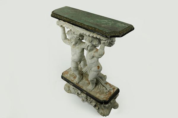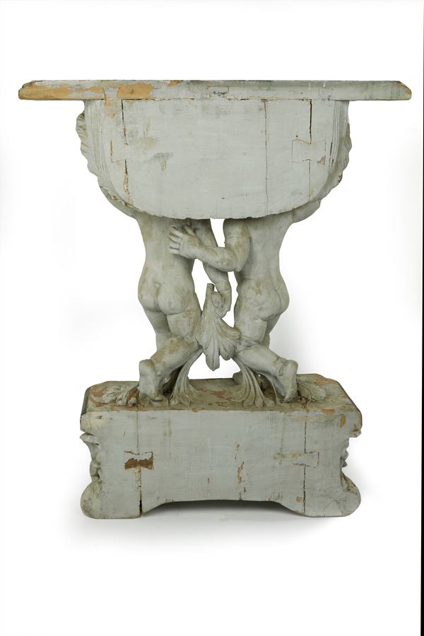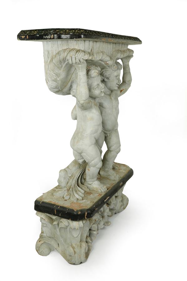 sorretto da due putti poggianti su base intagliata con girali fogliate