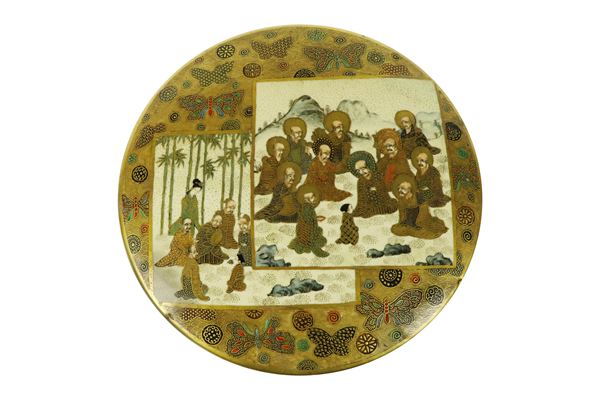 Contenitore in porcellana Satzuma con coperchio, raffigurante scene di monaci. Giappone, fine del XIX Secolo.