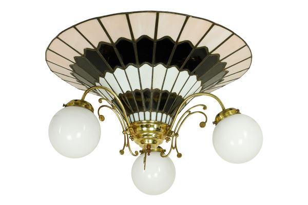 COPPIA LAMPADARI CON TRE CORPI LUMINOSI A SFERA E CORPO IN VETRO DI MURANO CON FINITURA AL PIOMBO, SOSTEGNI IN METALLO OTTONATO, ANNI 60