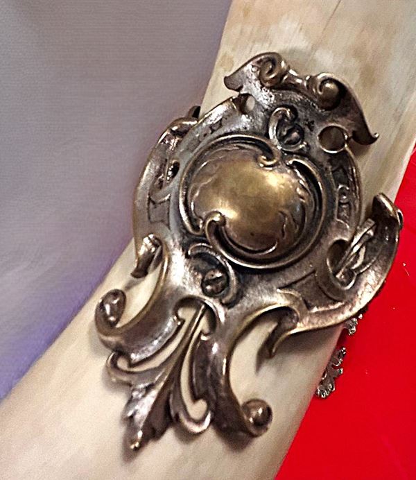 Importante corno potorio di bufalo con supporto in metallo argentato .