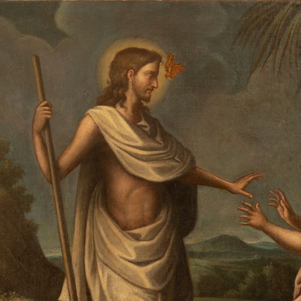 cm 46x34, cornice cm. 52.5x42.5 Olio su tavola di rovere raffigurante Gesù. Scuola fiamminga. Con cornice Salvator Rosa dorata a mecca, adattata.