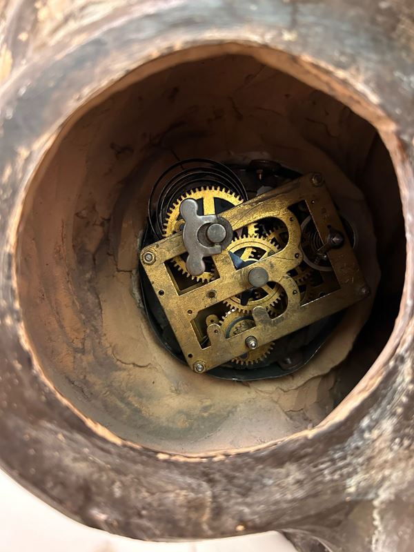 con orologio e che sorregge con il braccio destro uno specchio e lume