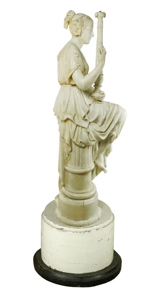 Figura allegorica femminile stante su piedistallo tondo mantenente nel braccio destro un candeliere.