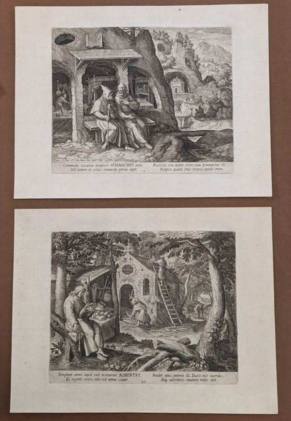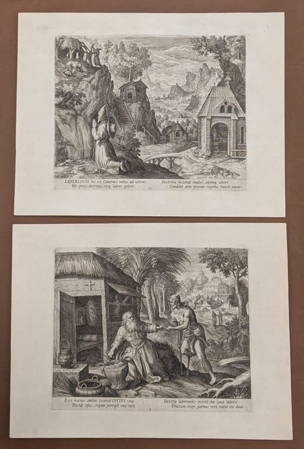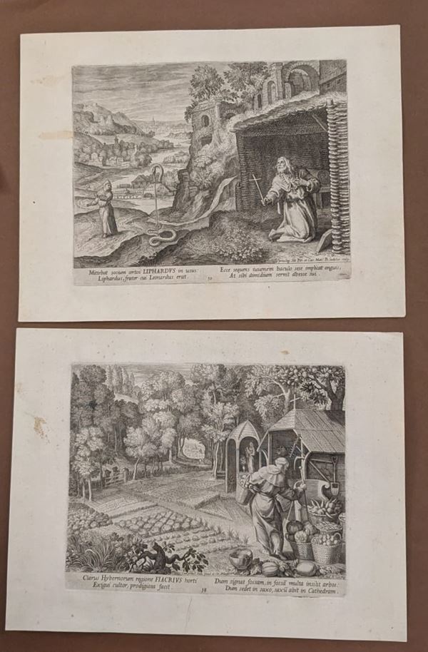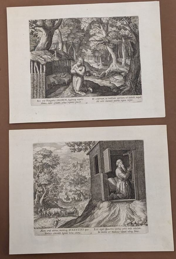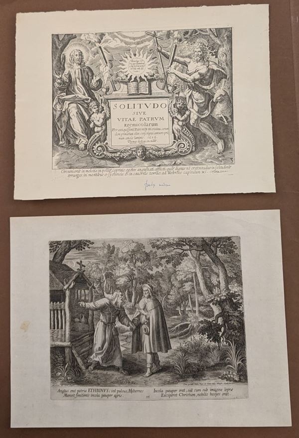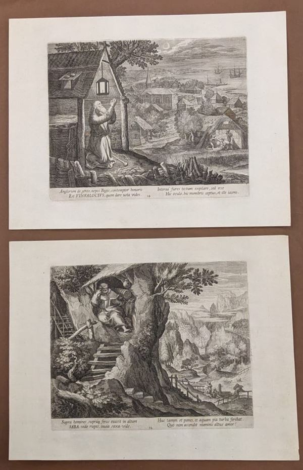 Lotto di 14 incisioni di anacoreti e un frontespizio incise da Raphael Sadeler da disegni di Martin de Vos