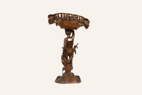 cm 67x44x22Centrotavola finemente intagliato con lumeggiature in oro sul tronco,sul cesto e tracce sul fogliame