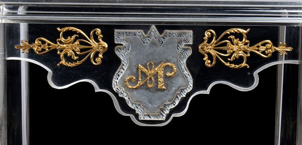cm 64x79,5x50Piano modanato a tre livelli, gambe cilindriche, grambiale con stemma serigrafato recante monogramma con le iniziali di Massimo Papiri in oro e decori a rilievo in bronzo dorato con racemi.