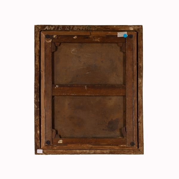 cm60x49,5; con cornice cm 67,5 x 56Al retro incollato nella parte bassa del telaio cartiglio con numero (593) ad indicare probabilmente una collocazione in una raccolta.