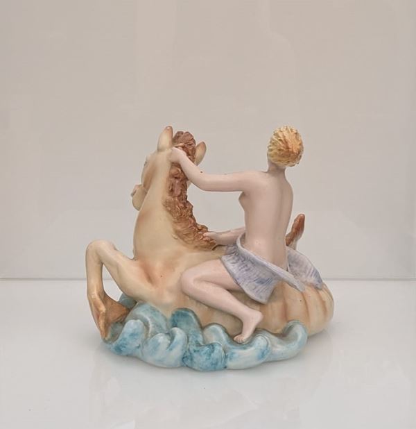 h 20 x 24 x 17 cm.Statuetta in maiolica raffigurante figura muliebre a seno scoperto che cavalca un ippocampo