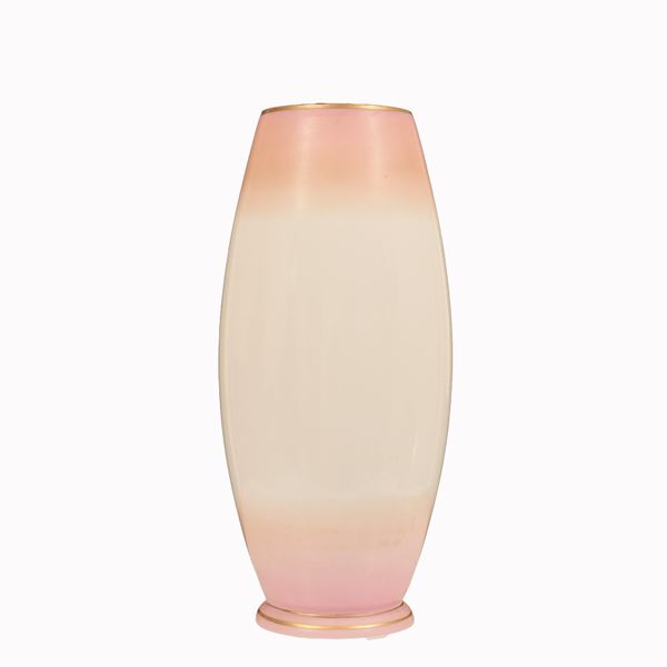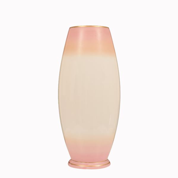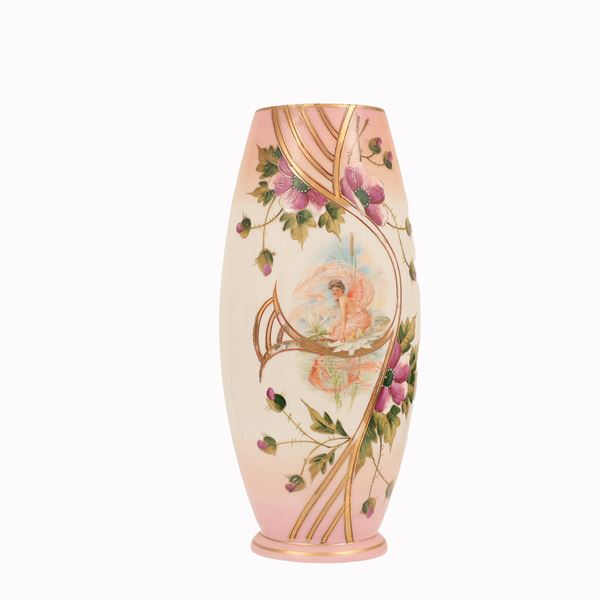 Cm. h 45 x 15 x Diametro base 10,5 / Diametro orlo cm 10Coppia di vasi liberty in opalina bianco, dipinti con serti fioriti di boccioli e fiori di viole, al fronte fate, una seduta su una ninfea, l'laltra, su l'altro vaso, in piedi aggrappata con le mani ai petali di un fiore.