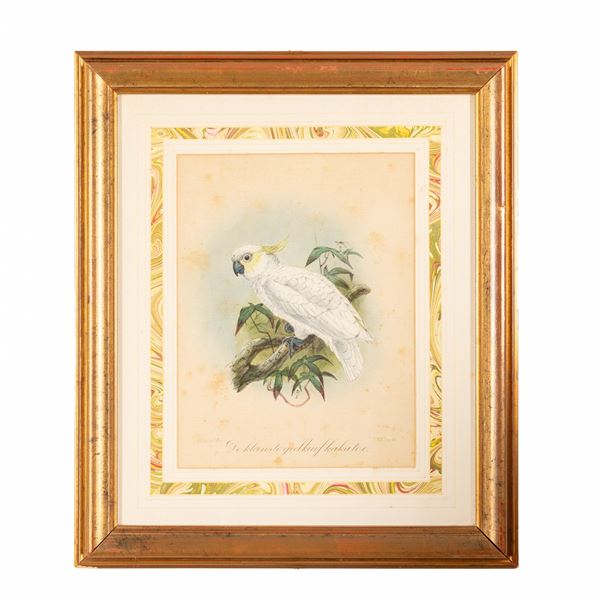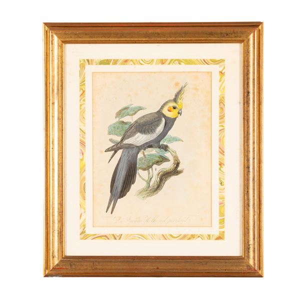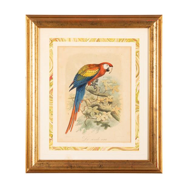 Lotto di 3 incisioni acquerellate rappresentanti pappagalli