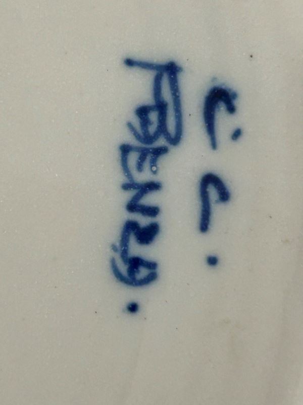Piatto in ceramica con paesaggio fluviale nel cavetto e grottesche alla tesa