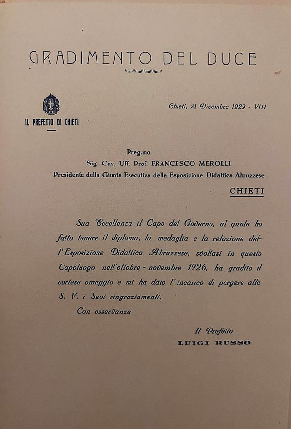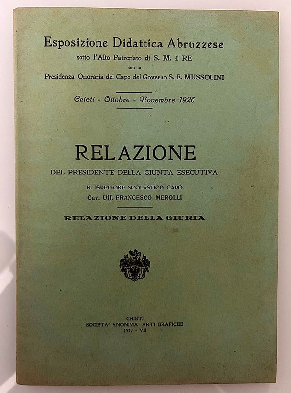 Nel lotto è compreso il catalogo "Relazione del Presidente della Giunta Esecutiva dell'Esposizione Didattica Abruzzese" stampato in Chieti per la Società Anonima Arti Grafiche, 1929.