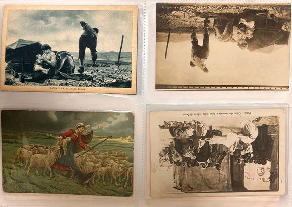5) Lotto di due cartoline, una viaggiata l'altra no, con riprodotto Le orfanelle di Teofilo Patini edito da Bromostampa Torino 1925. Una delle due viaggiata è indirizzata ai Coniugi Tenaglia di Chieti e datata L'Aquila 13 giugno 1932