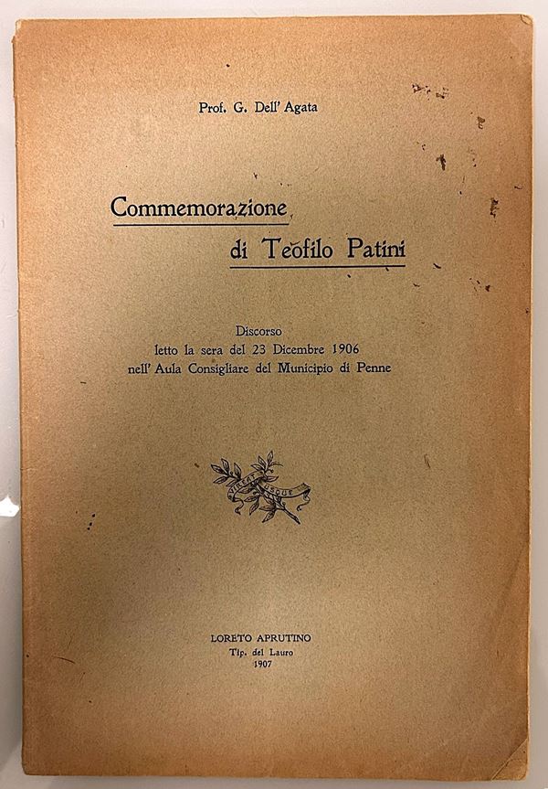 40) Prof G. dell'Agata Commemorazione di Teofilo Patini. Discorso letto la sera del 23 Dicembre 1906 nell'Aula Consigliare del municipio di Penne Loreto Aprutino Tip. del Lauro 1907