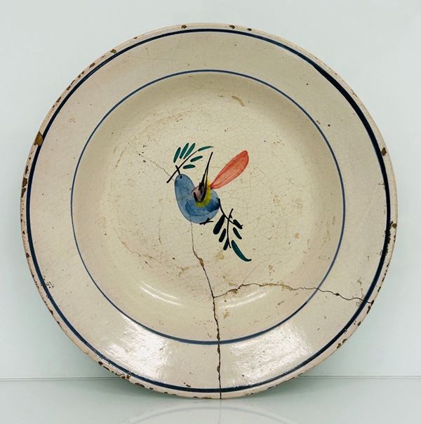 Il piatto più grande è istoriato nel cavetto con il classico decoro castellano ad uccellino a terra, l'altro con uccellino sui rami.