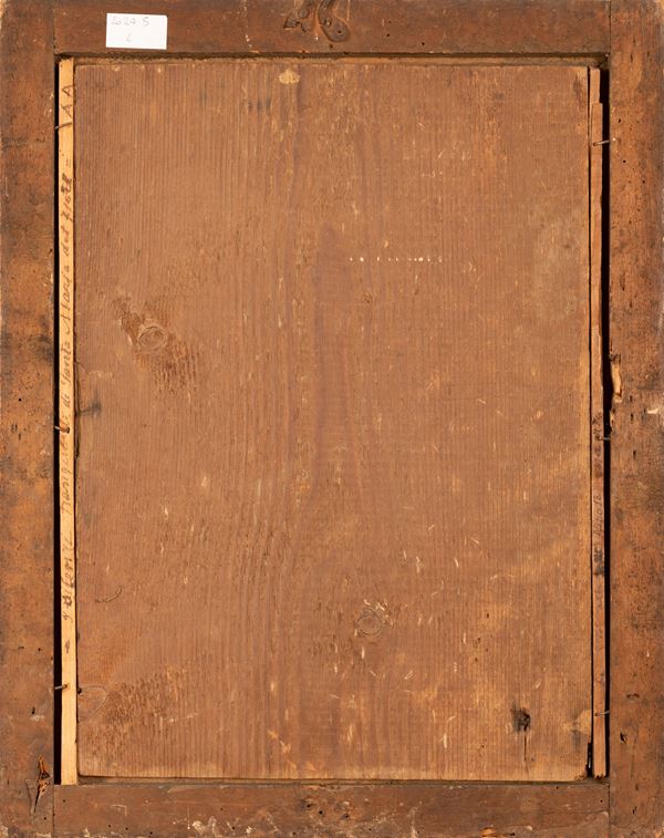In cornice dorata non coeva alla quale la tavola è stata adattata tramite due listelli in legno che recano vecchie iscrizioni.