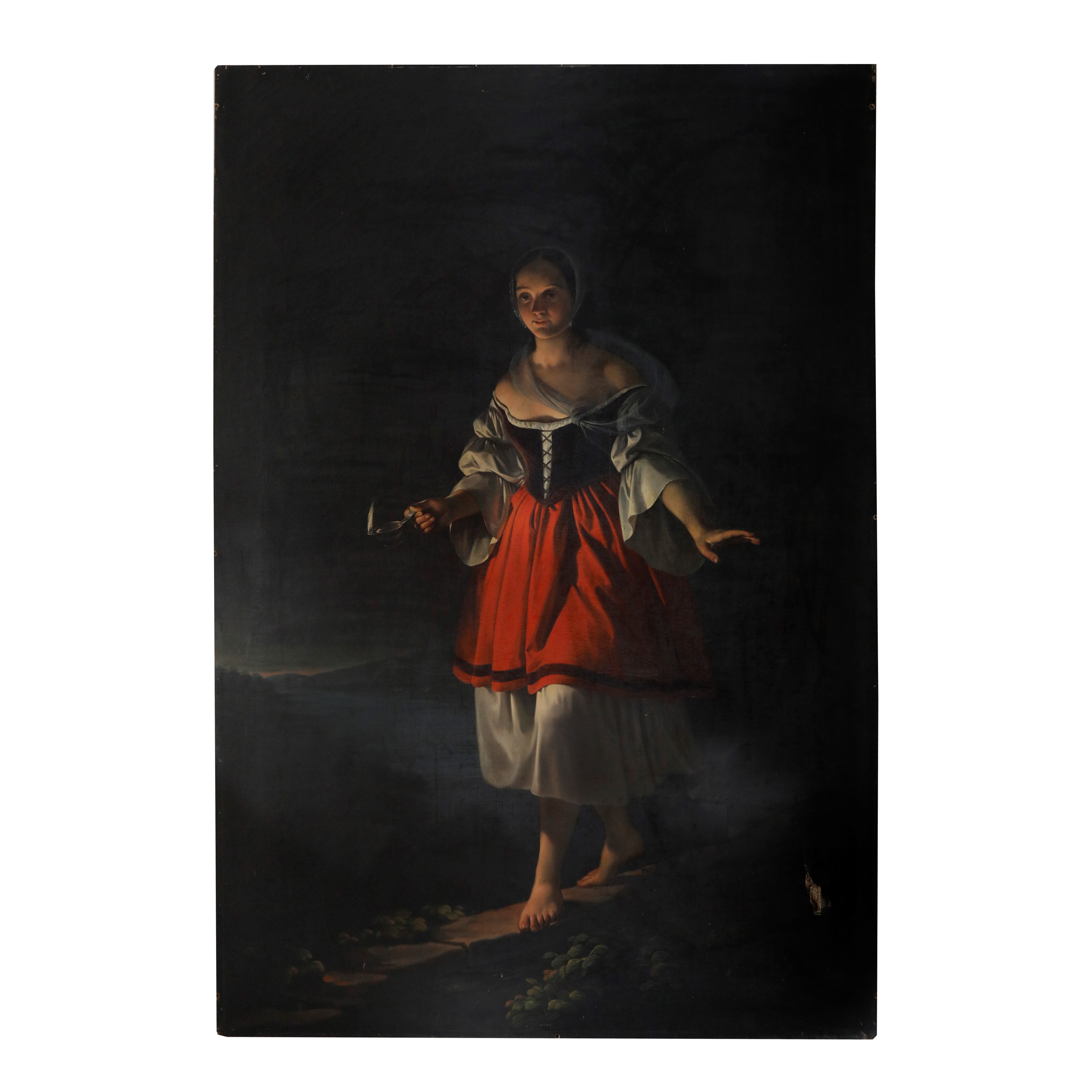 Il quadro ritrae una giovane donna con in mano una lucerna mentre in equilibrio su di un muretto si muove verso un ignoto che lo attende, mentre al suo lato si apre un lago dalle acque nere e profonde. Clemente Alberi, pittore neoclassico che molto si è ispirato anche alla lezione di Caravaggio, nel quadro si serve di una giovinetta che si muove tra la ricerca della stabilità e serenità, che traspare anche dal volto, rappresentata dall’equilibrismo sul muretto, e la luce della saggezza, la lucerna, che conduce il suo cammino di giovane verso un futuro ignoto ma bello. Quello qui proposto da Alberi è un tema simbolico, presente nella pittura seicentesca, differente dalla maggior parte della sua produzione prevalentemente rivolta a ritratti, soggetti, storici e religiosi in questo caso l’artista si avvia su di un percorso simbolico e comunque bene augurante pieno di speranza per la e le giovani tutte
