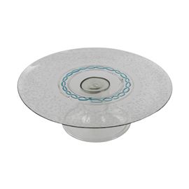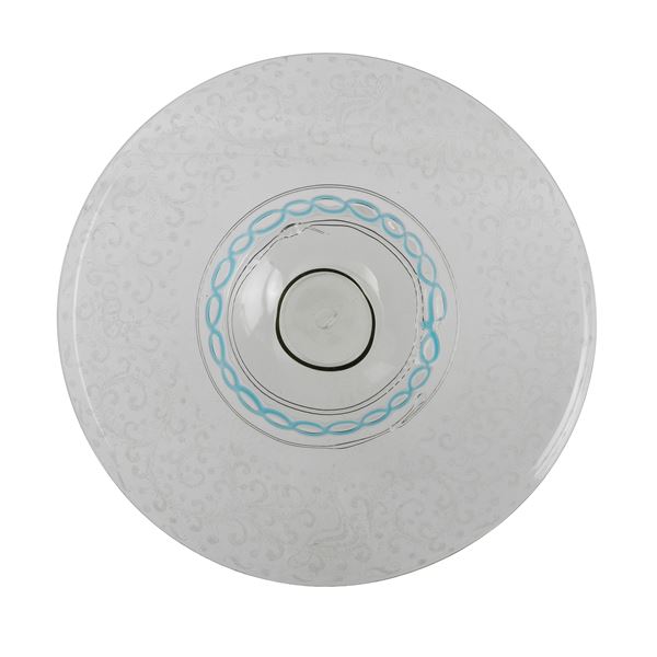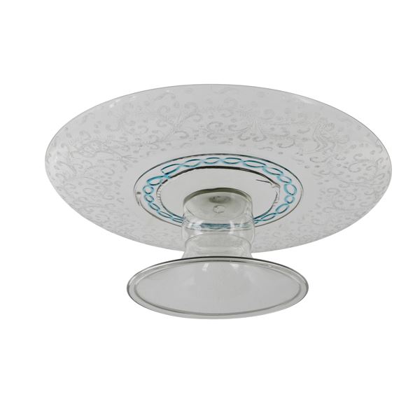 Alzata centrotavola in vetro sottilissimo con decori floreali e particolari azzurri