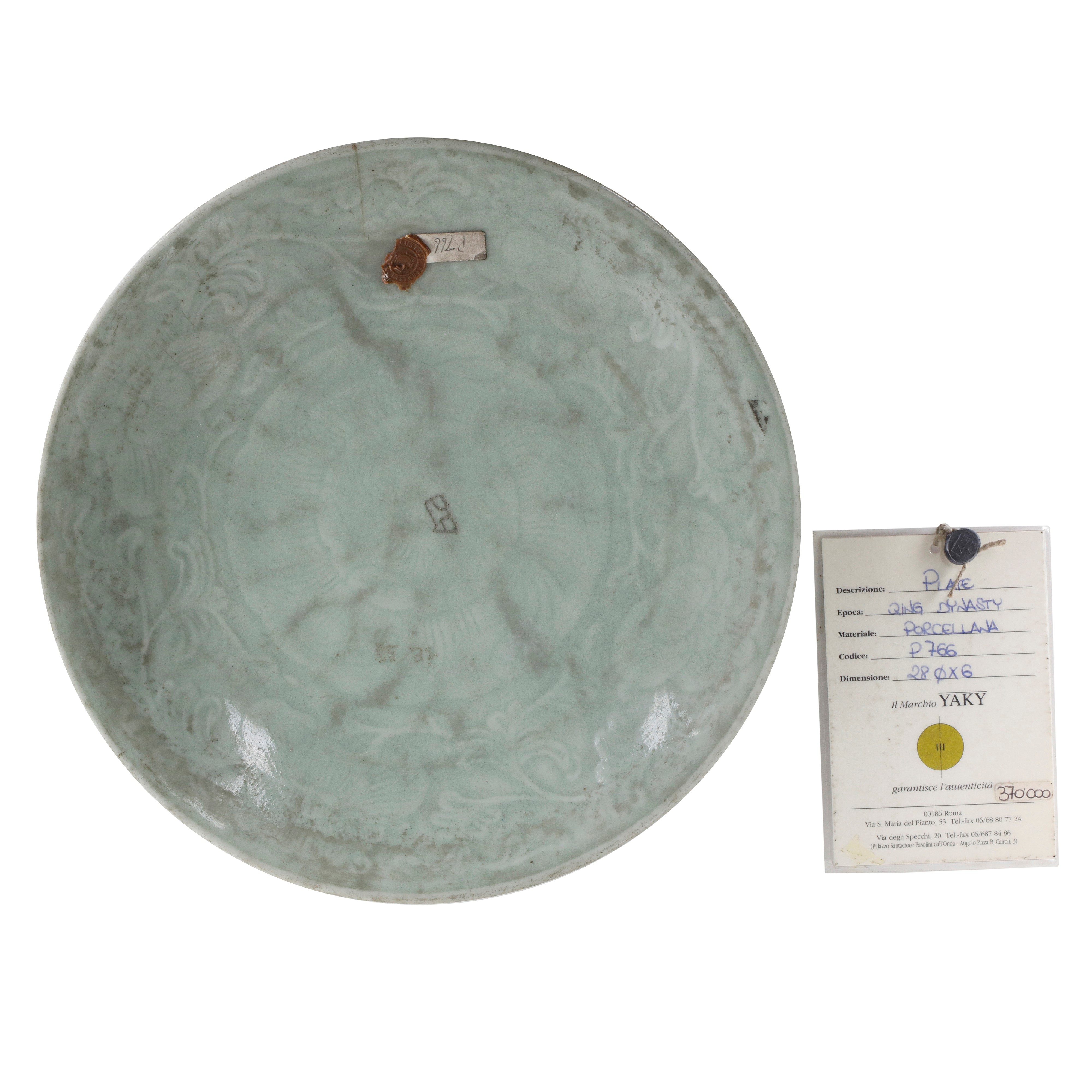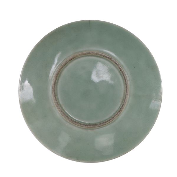 Piatto in porcellana Celadon a decoro naturalistico, Cina, dinastia Qing.
