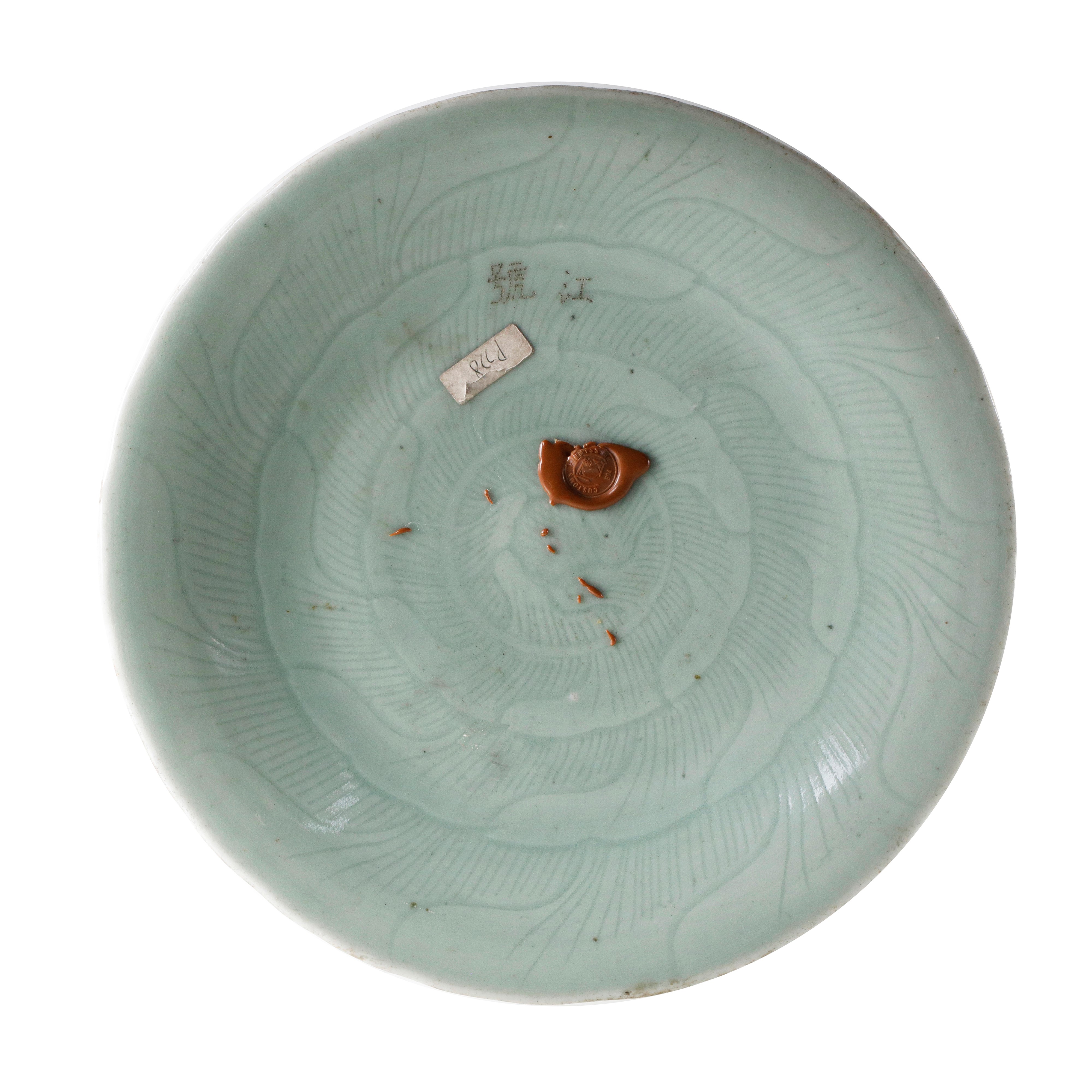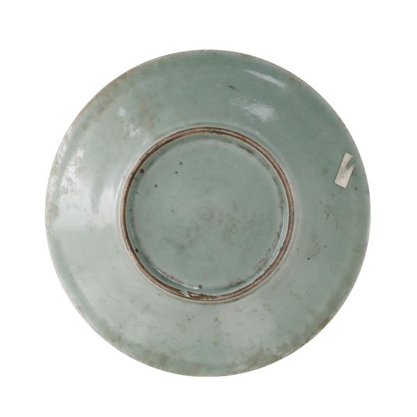 Piatto in porcellana Celadon a decoro naturalistico, Cina, dinastia Qing.