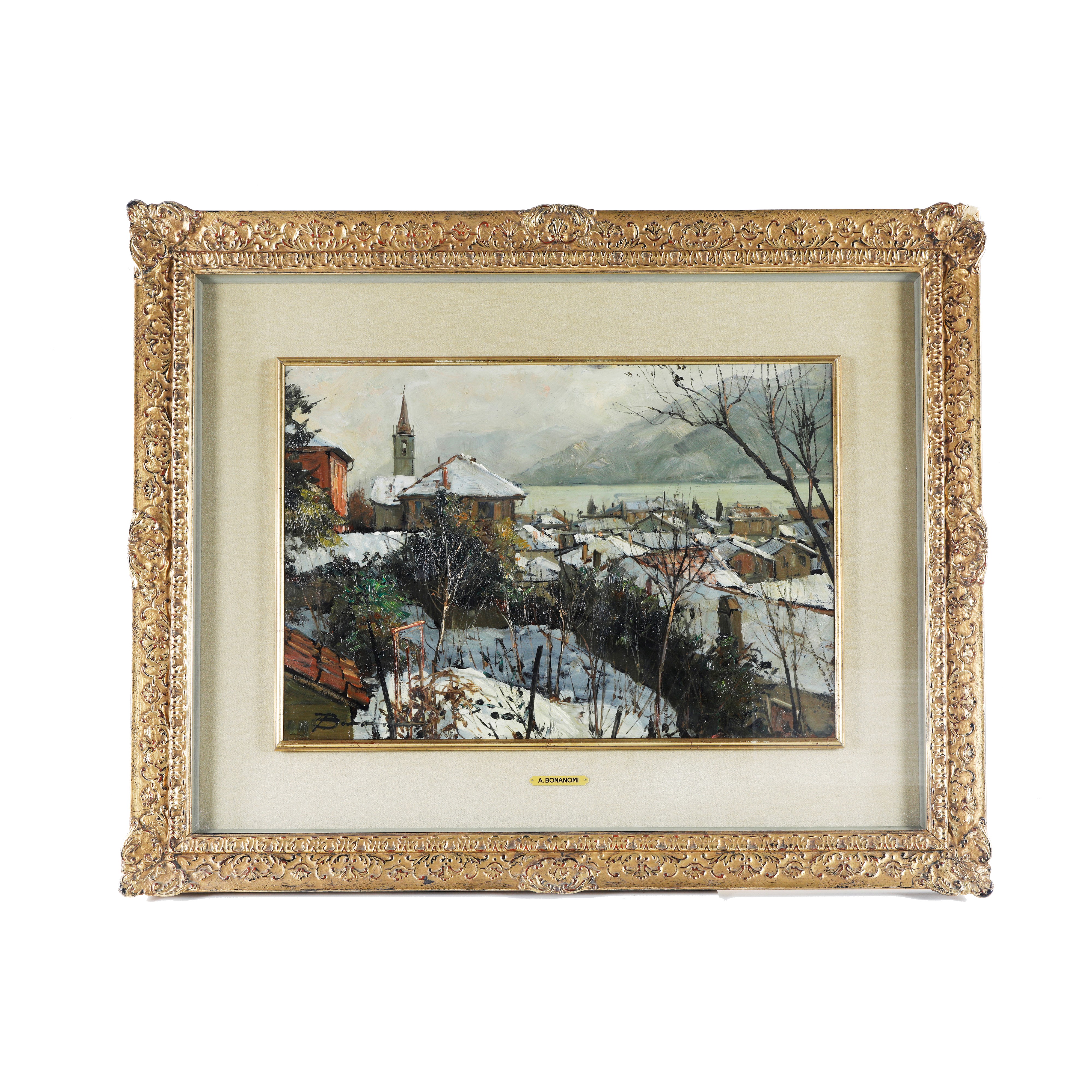 Olio su TelaDipinto olio su tela raffigurante paesaggio innevato di di Varenna sul Lago di Como.