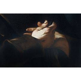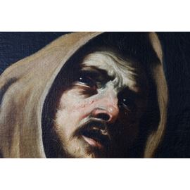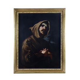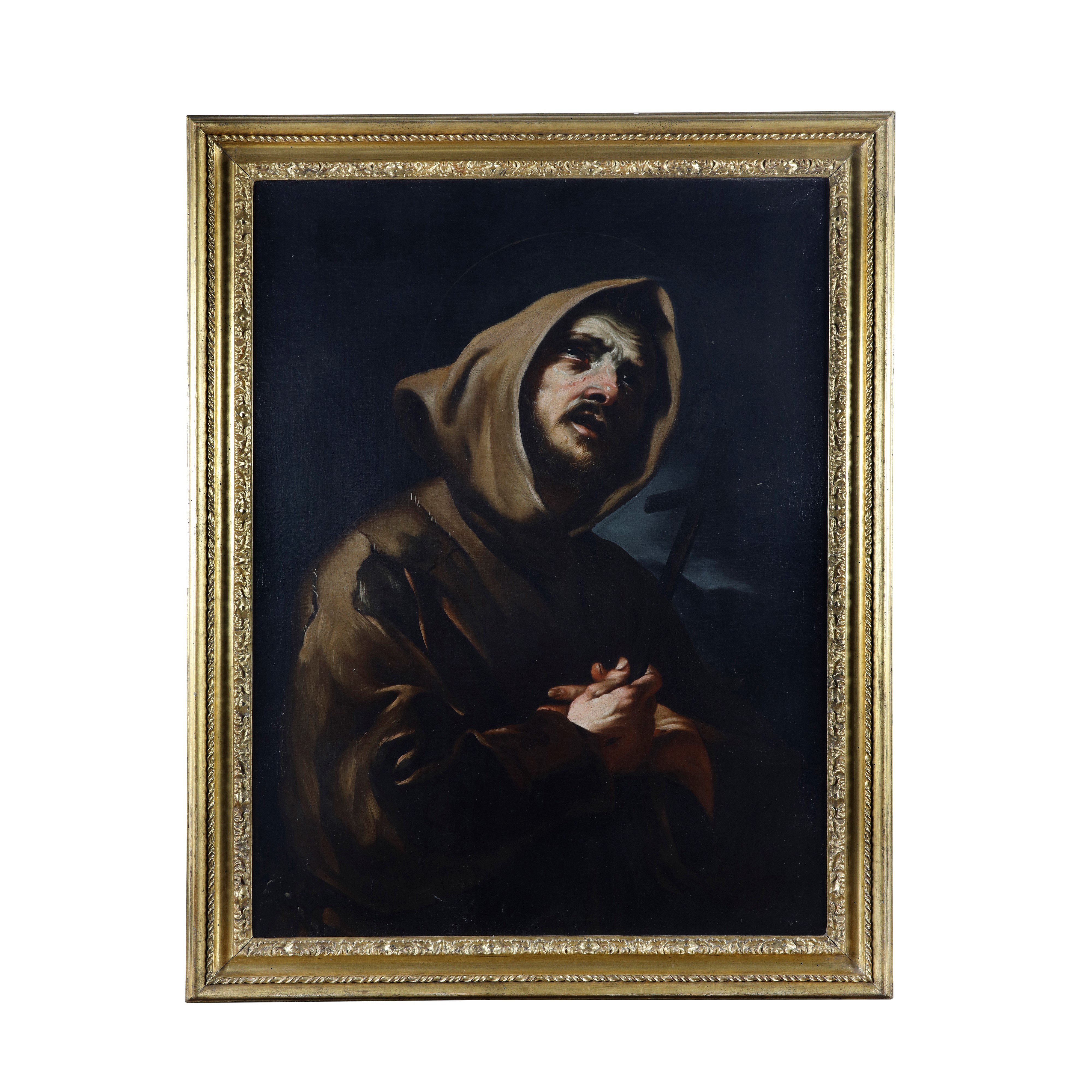 Dipinto Olio su tela raffigurante San Francesco in estasi, con croce in mano, in cornice intagliata e dorata, stile Salvator Rosa.