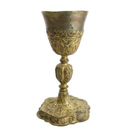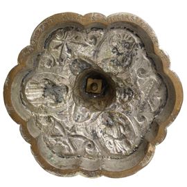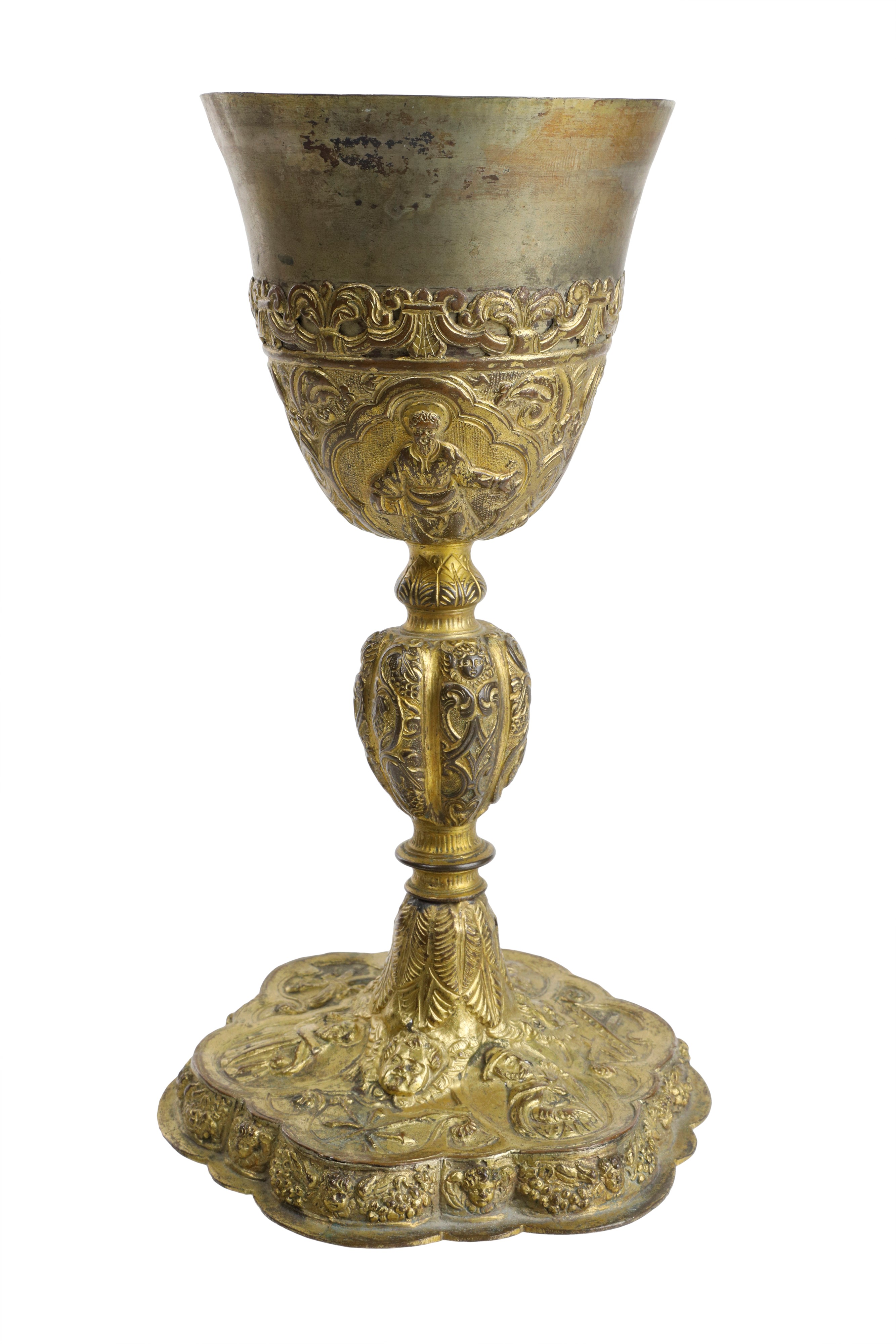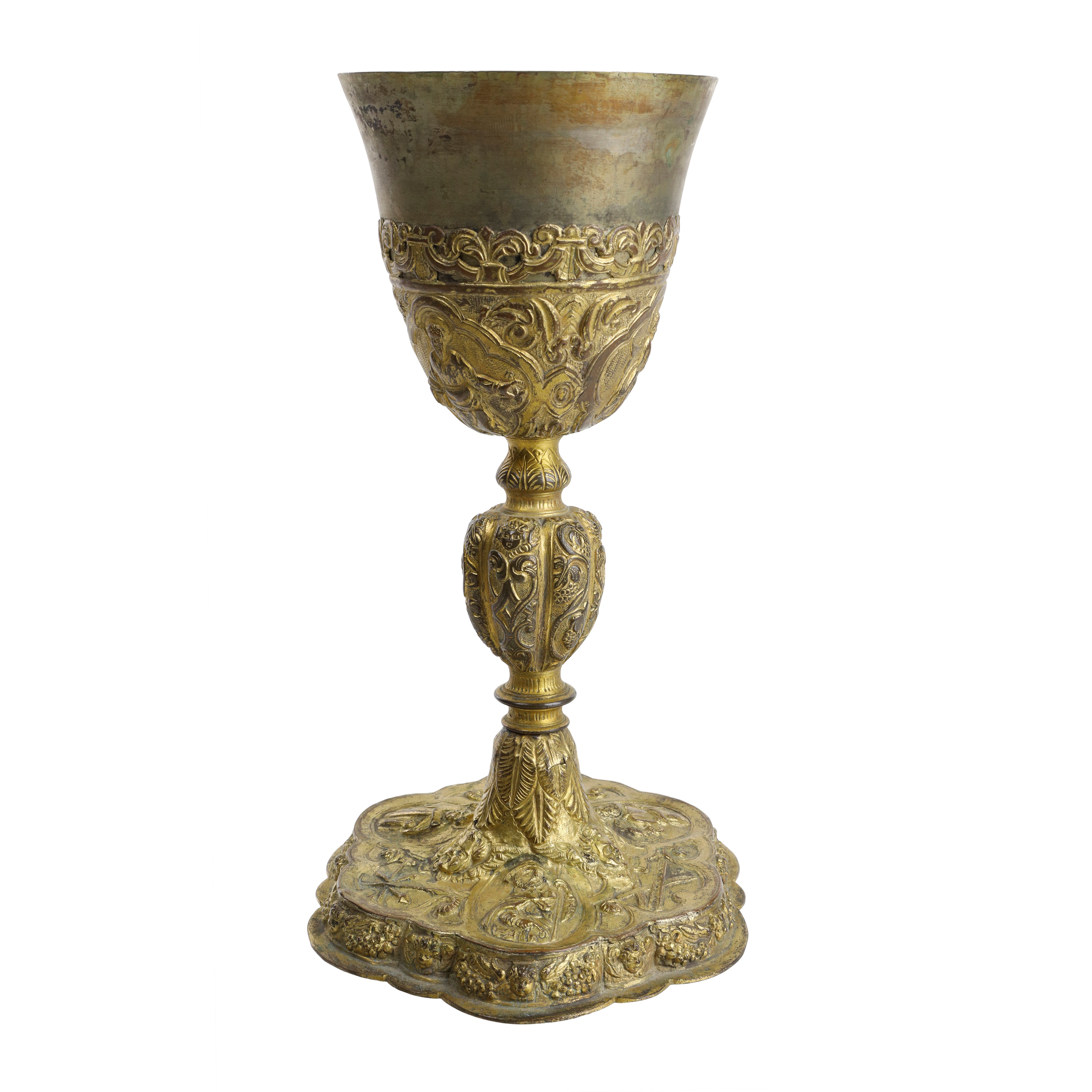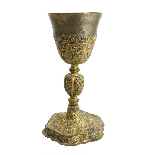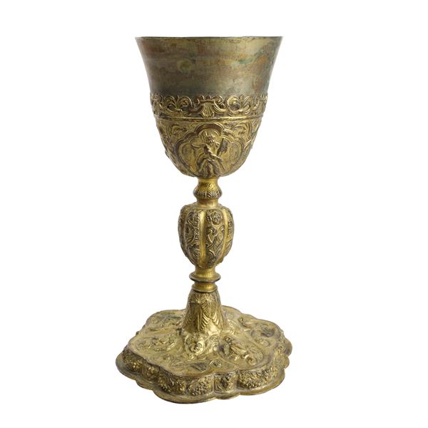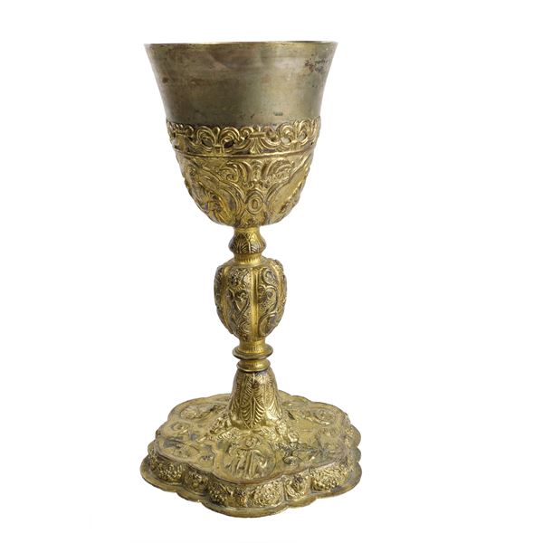 Piede bombato con base mistilinea riccamente cesellato con cherubini e grappoli d'uva, immagini di Santi.