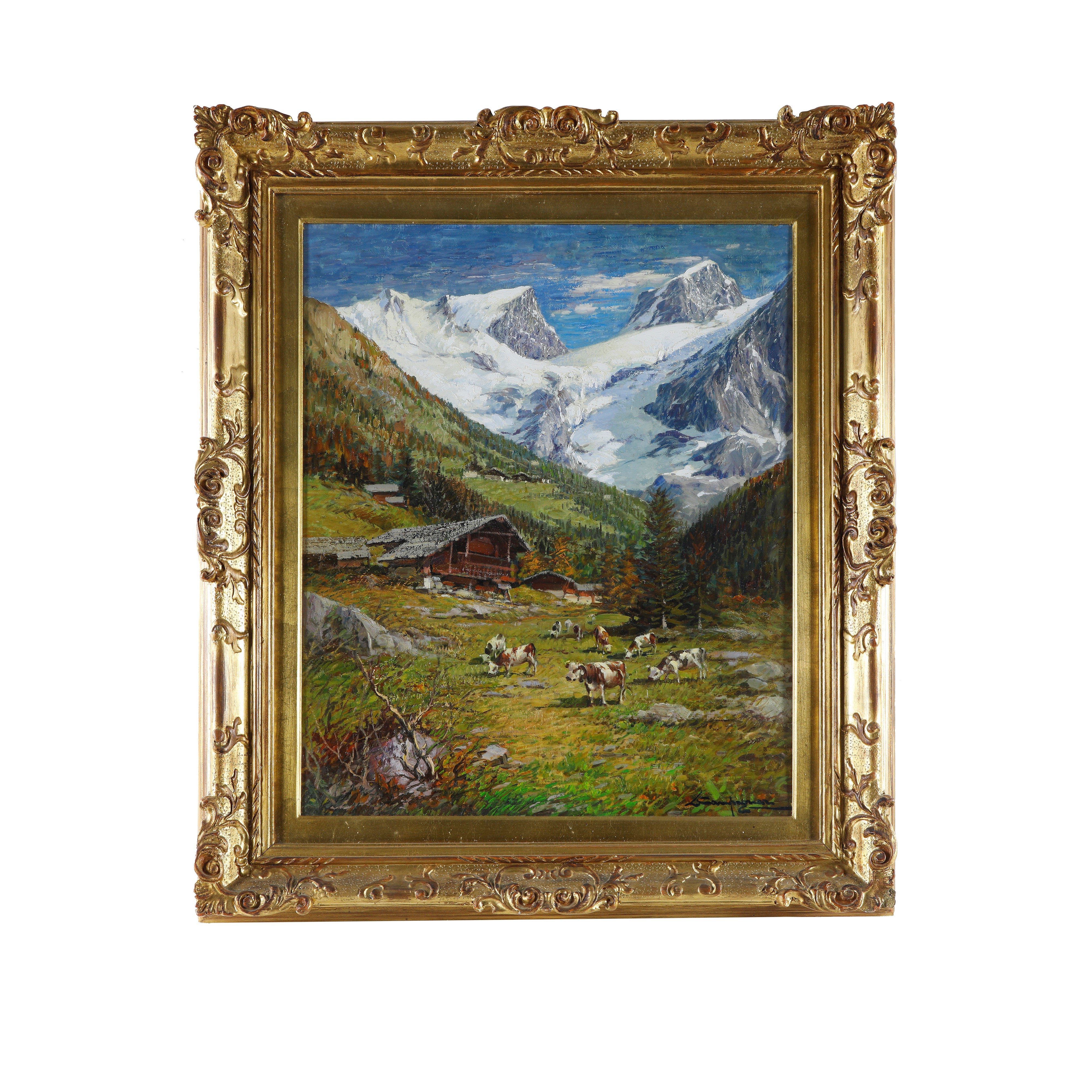 Dipinto olio su tela raffigurante paesaggio alpino con pascolo di buoi, baite e sullo sfondo il Monte Rosa (Valle D'Aosta).