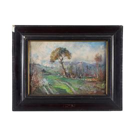 Dipinto pastello su cartone raffigurante paesaggio, firmato in basso a destra.