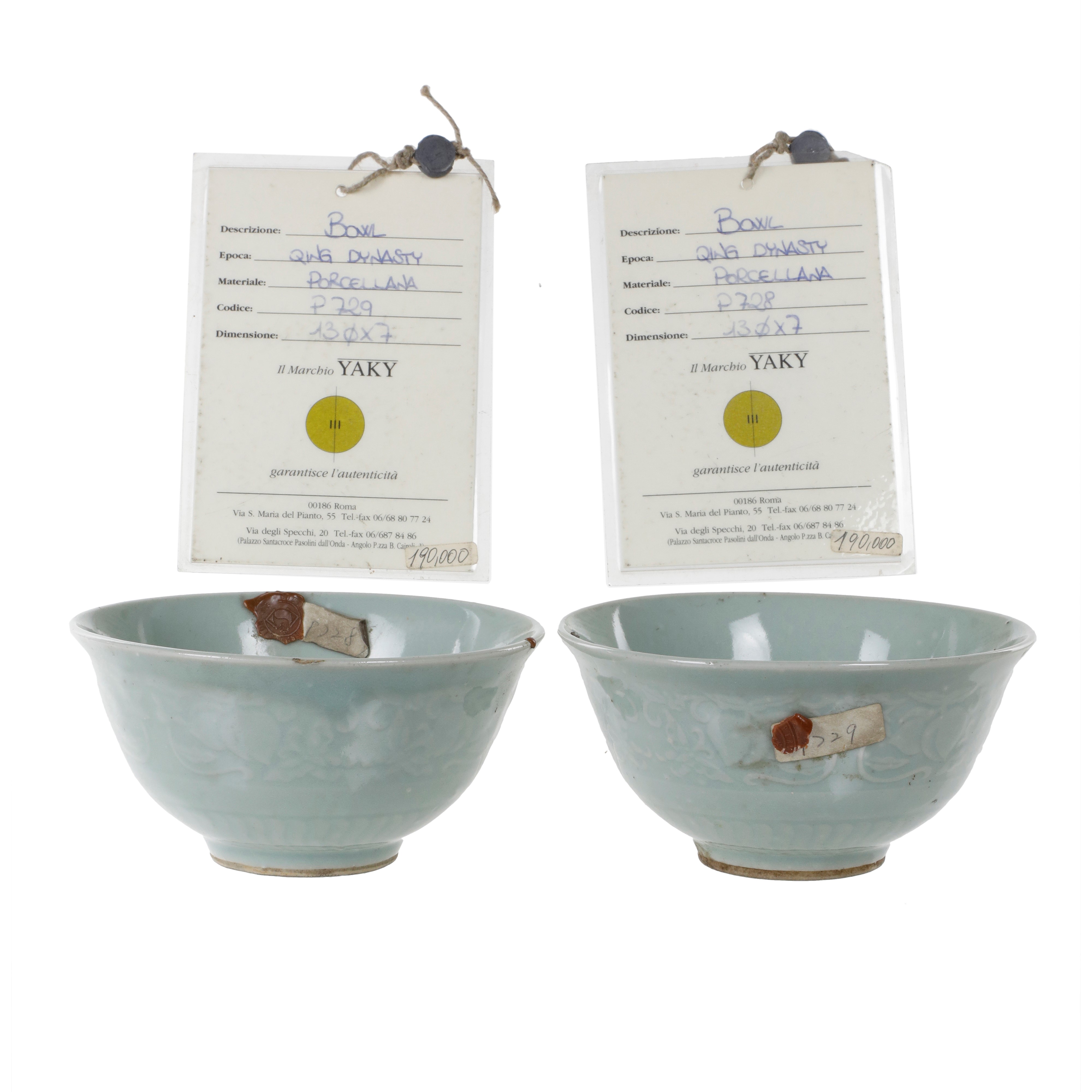Coppia di ciotole in grès a smalto celadon con decoro floreale, dinastia Qing.